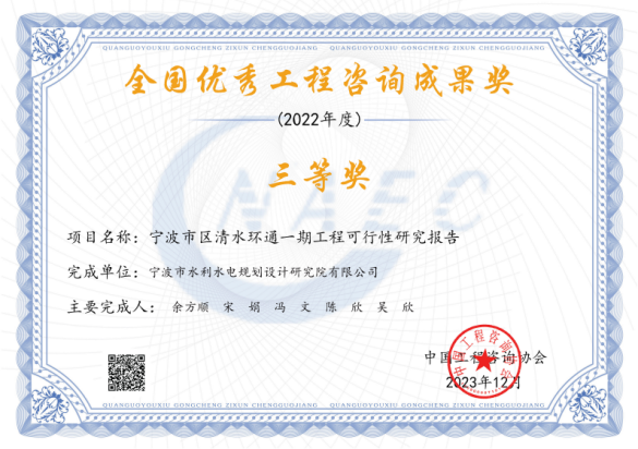 在工程項目方面,獲得2022年度全國優(yōu)秀工程咨詢成果獎、2024年度寧波市優(yōu)秀勘察設(shè)計獎、2024年浙江省勘察設(shè)計行業(yè)優(yōu)秀勘察設(shè)計”綜合類成果獎、寧波市優(yōu)秀水利工程設(shè)計二等獎、“浙江省文明標化工地”稱號、“2024年度寧波軌道交通市域鐵路工程立功競賽先進集體”等各類獎項十余項。